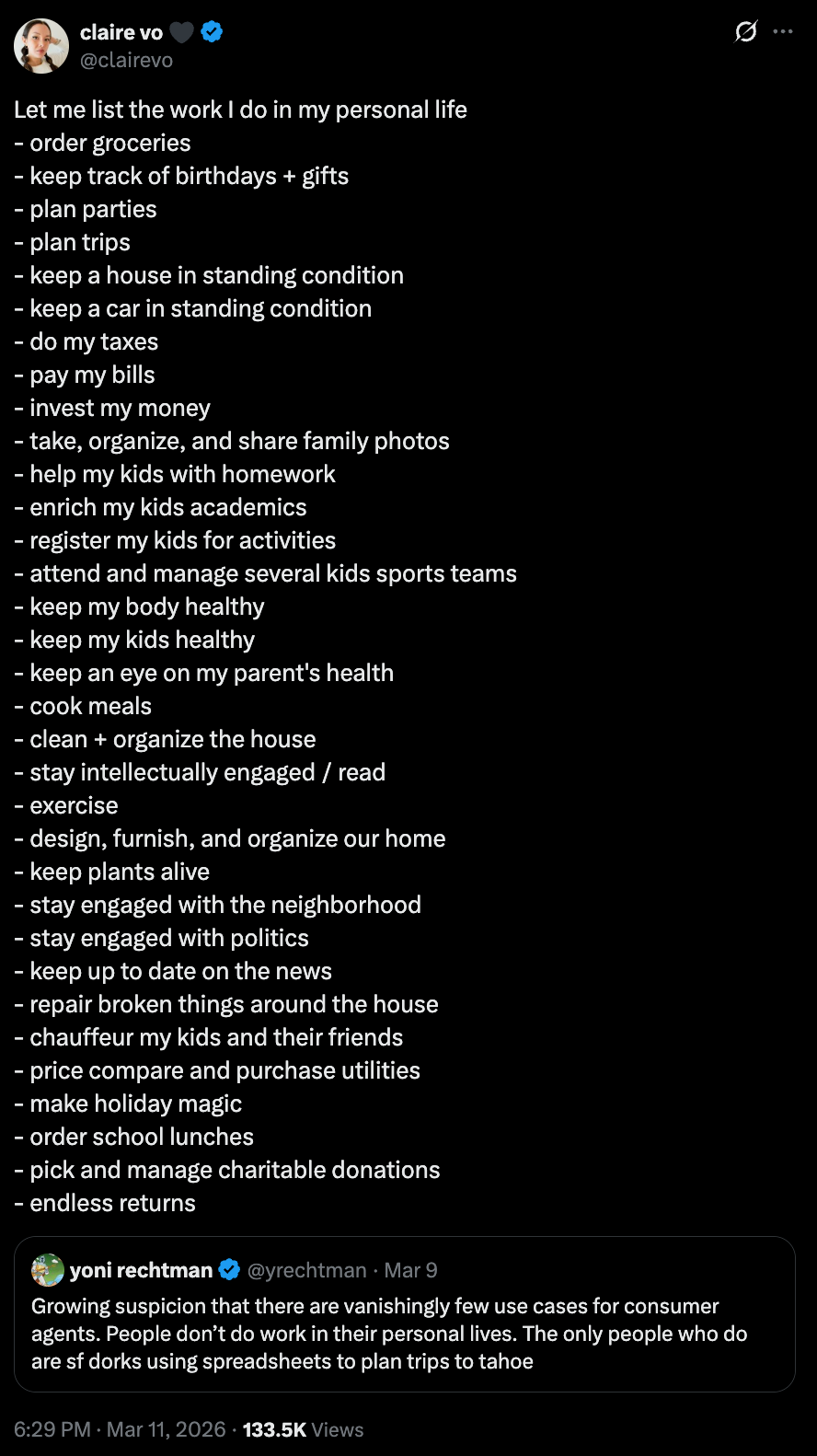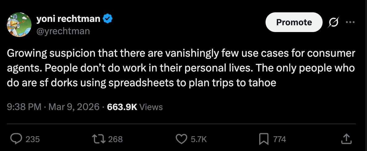 The confusion in the discourse is collapsing “AI is useful” into “agents are the future of consumer,” and those are completely different claims.