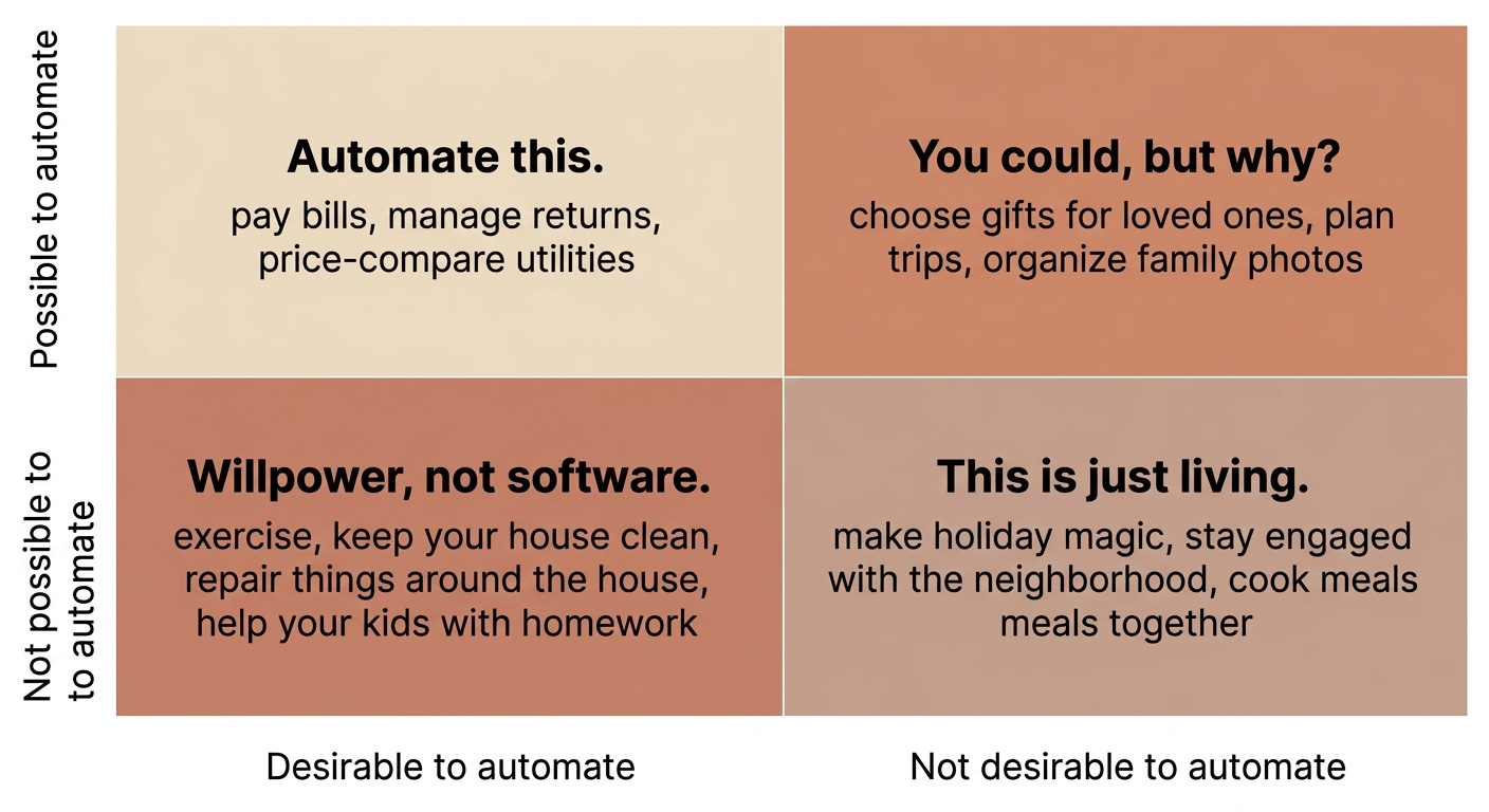 The only way to make agents work for most of that list is to profoundly change yourself to live for the AI instead of the other way around. We already do this in small ways (saying things aloud to ensure Granola hears it, etc). In darker terms it will mean avoiding paths inaccessible to the agents: only buying what can be delivered is an atomized, limited life.