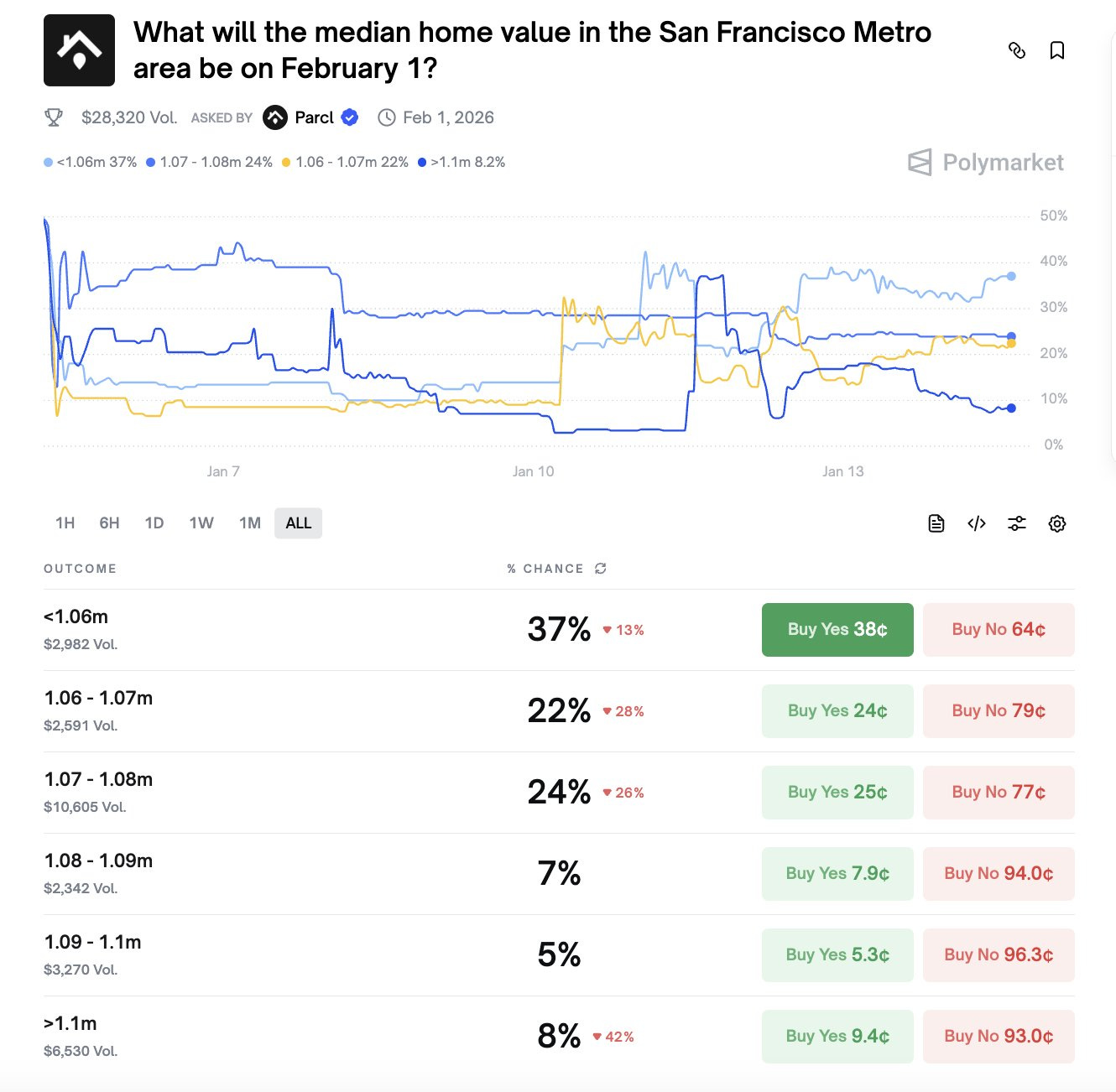 Polymarket is now doing local home price prediction markets. Basically you can bet on whether or not an index of home prices/rents will go up or down in a given geography over a given period of time.