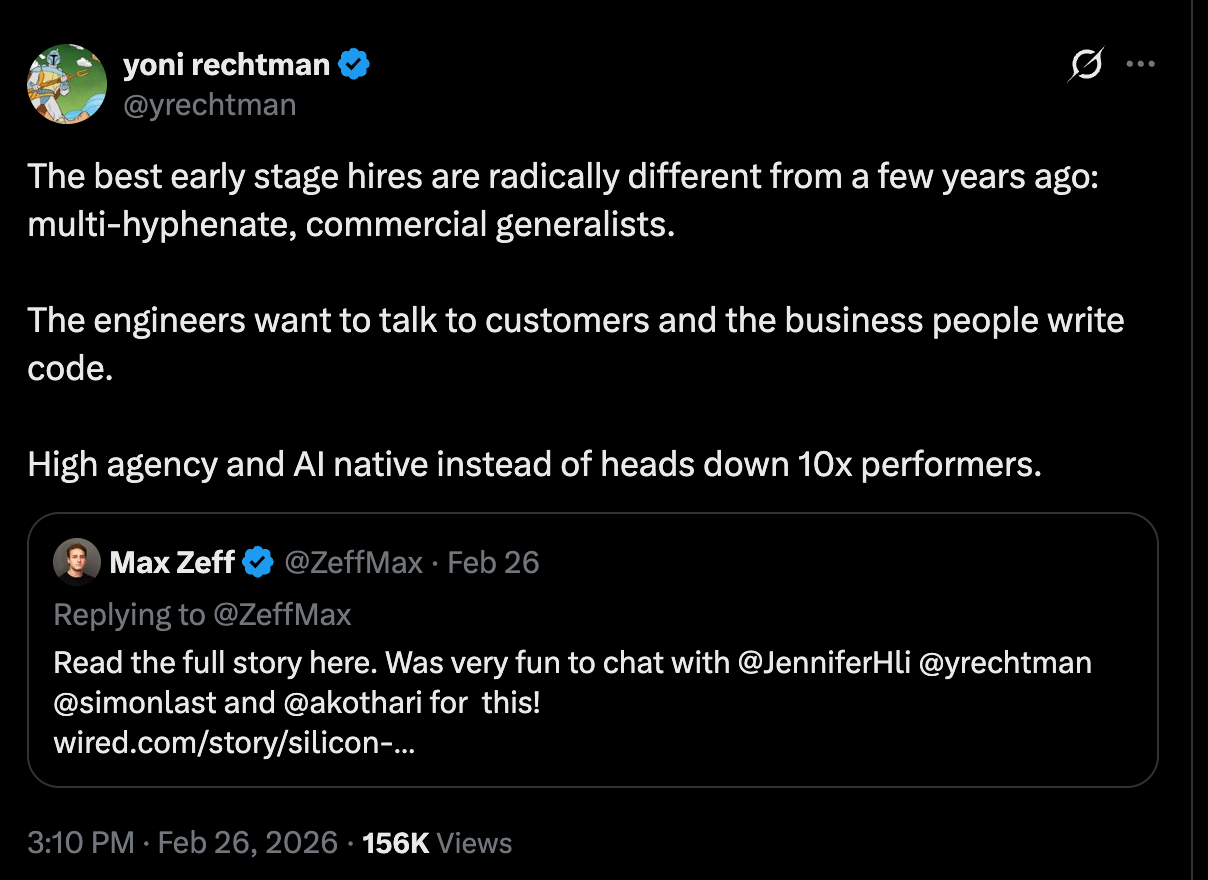 The best AI native companies are increasingly recruiting commercially minded engineers regardless of the role. They explicitly want people who are comfortable using tools AND thinking about product AND thinking about customers. The salespeople are shipping (at least internal tools and automations for themselves) and the engineers are relentlessly focused on customer value.